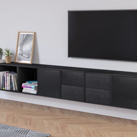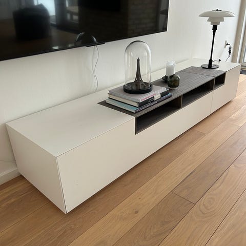 Egetræslook, ikke massivt eg, laminat. Har enkelt brugsspor fra lågen på vitrinen. Tv bord med glasvitrinen. Hængevitrinen som vi også sælger følger med tv reolen, hvis ønsket. Skal skilles delvist ad og med lille elevator fra 9. Sal på Lundtoftegade på Nørrebro. Der følger en hylde med som hører til sættet, men ikke er afbilledet. Der er tre skuffer og 2 låger.