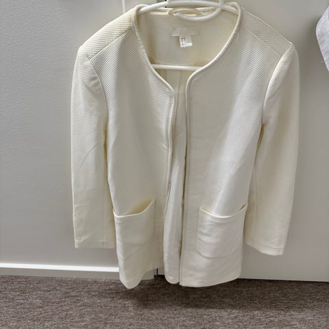 H&M Andre jakker til kvinder i størrelse 36. Jakken er beige og har detaljer med quiltede ærmer. Den har en lynlås foran og er fremstillet i et tekstureret materiale.