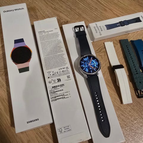 Samsung Galaxy Watch6 Classic smartwatch i sølvfarve med en urkasse på 47 mm. Uret har en rund urskive og er designet til at blive båret på håndleddet. Den har funktioner til sundhedsovervågning, notifikationer og tidtagning, og er kompatibel med Samsung-enheder og andre smartphones.