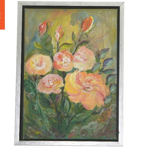 Farverigt maleri af blomster i en simpel trærame med dimensionerne 34x22 cm. Bagsiden af rammen viser en snor til ophængning.