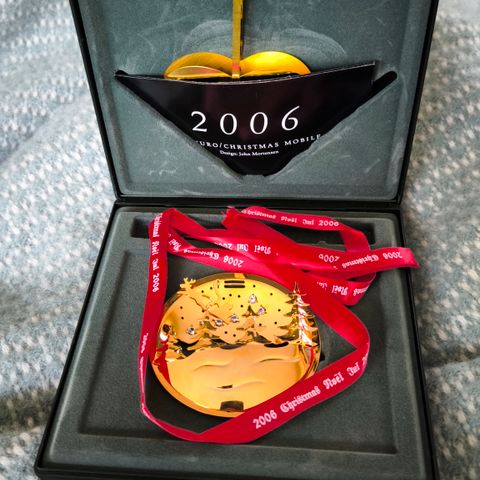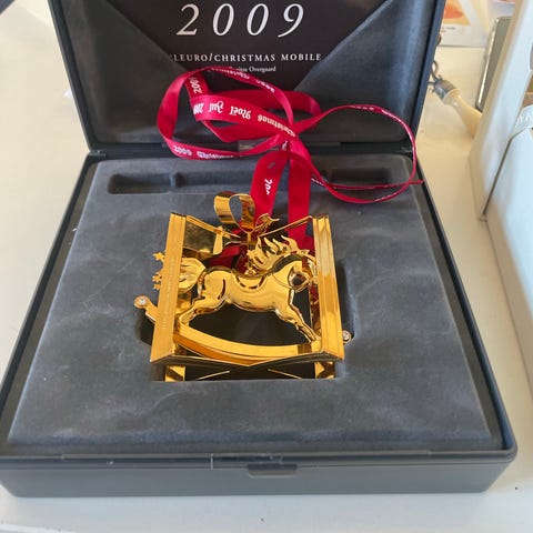 Georg Jensen 2016 Jule uro i guld med tilhørende sort opbevaringsæske. har en dekorativ krans og leveres med to bånd i rød og grøn farve. Produktet er designet som en samlerobjekt og leveres i original emballage.