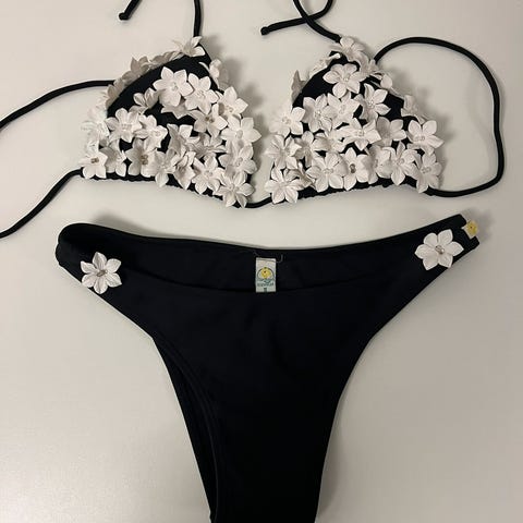 Bikini fra Powel Flower trusserne er str. 50 og BH et str. 48. Jeg bruger normalt str. L. Der pailletter på BH samt foran på trusserne. Farven er lilla , Sort og lyse blå/ petroleum.