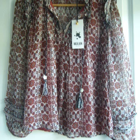 Bluse, Mærke: MOLIIN Copenhagen. Lys beige bund, med rød-blå blomstermønster. Lange ærmer. Rund halsudskæring. Bisse-læg ned langs front. Nederst et let rundet påsat skød, som er åben / krydser over i hver side.