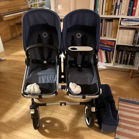 Pram includes bassinet, and second seat with adapters, also includes two travel bags, one for the pram and the second for the extra seat. Has a snack tray, and spare leather arm restraint. There are rain covers for everything. Finally there is a piggy back board. Everything you need for a new born and a second.