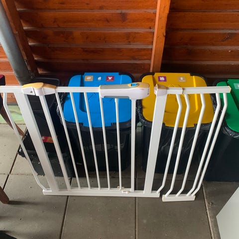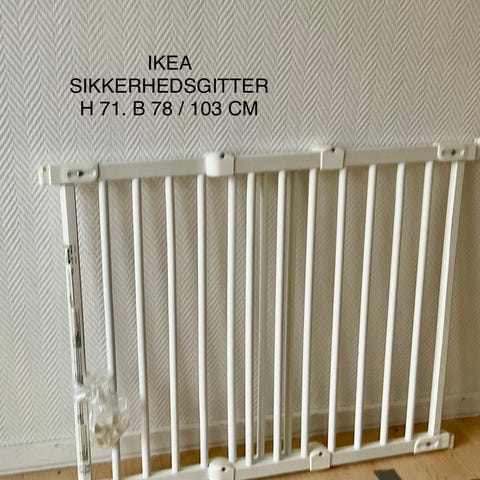 IKEA Børnegitter Sikkerhedsgitter i hvid metal. Designet til at sikre børns områder ved at blokere adgang til trapper eller rum. Passer til standard døråbninger og kan monteres sikkert med justerbare beslag.