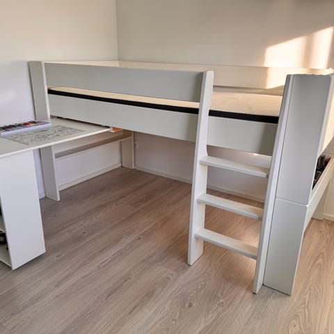 Smart , robust og funktionel halvhøj seng til drengeværelset, med god plads til opbevaring i trappesektionen som har dybe rum. Perfekt til legetøj, bedroller, bamser osv. Tilmed er der god mulighed for hyggelig hule under sengen.