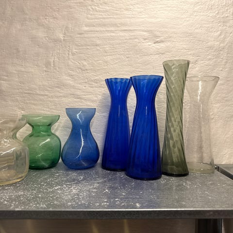 To hyacinthglas i smuk koboltblå og smaraghgrøn farve. Højde 20,5 cm. Sælges for 50 kr. per stk. eller 80 kr. samlet ved kontant betaling eller mobilepay og afhentning i Holte. Sendes ikke.