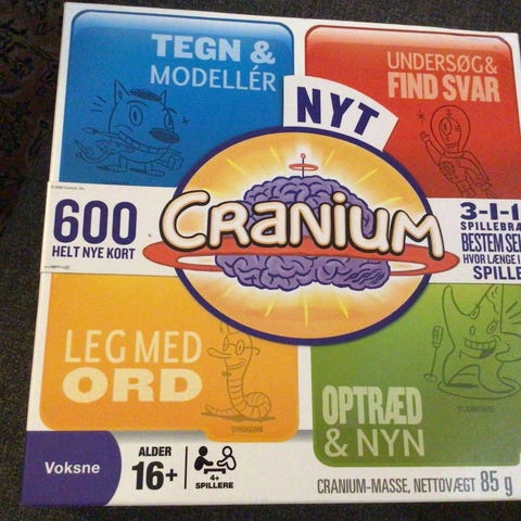 Cranium Brætspil Familieudgave, voksne må også lege, med forskellige kategorier som fakta, ord, tegning og modelbygning. Indeholder spilleplade, spillebrikker, kort og spilleudstyr. Velegnet til 4-16 spillere i alderen 16 år og opefter. Dansk version med instruktioner og materialer til socialt og underholdende spil.