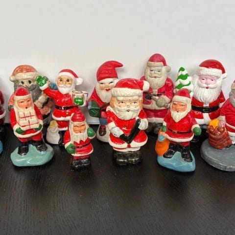 Lot samling julemænd fra 50’erne 60’erne 70’erne 80’erne julemand julepynt vintage gammeldags bla en julemand i faldskærm på gynge, med bas
