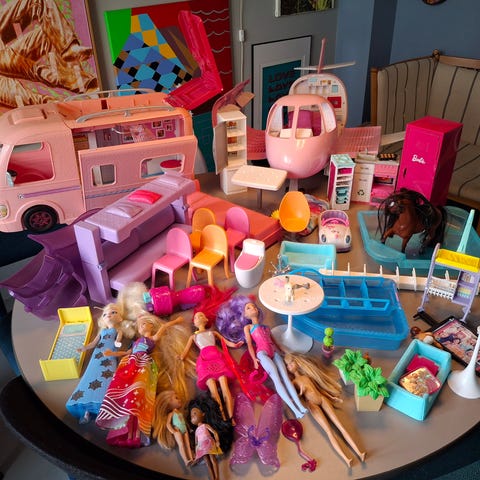 Vi sælger alt vores Barbie da pigerne ikke leger med det mere. Her er mængder af dukker, sko, mad, huse, heste, stald, biler, cykel, swimmingpool, og den legendariske kombinerede jet og party færge med lyd og lys.