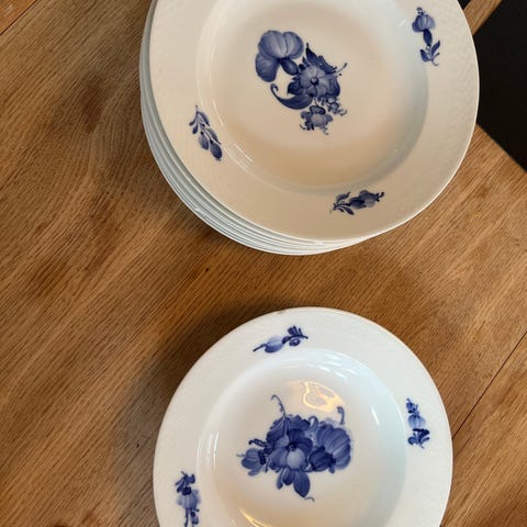 Royal Copenhagen Blå Blomst tallerkener i porcelæn, 2 stk. Hvid med blå blomsterdekoration, klassisk mønster. Diameter ca. 19 cm. Egnet til servering af mad.