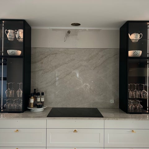 vitrineskab med glasdøre og træ. Skabet har indvendige træhylder samt indbygget belysning. Velegnet til opbevaring og fremvisning af service, glas og andre genstande i køkken eller stue. Multifom. Bredde 30 cm. Højde 60 cm længde 80 cm