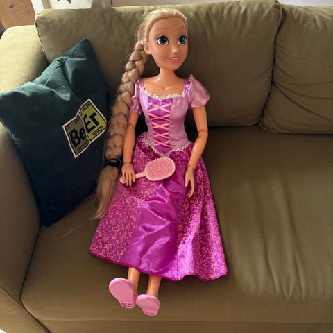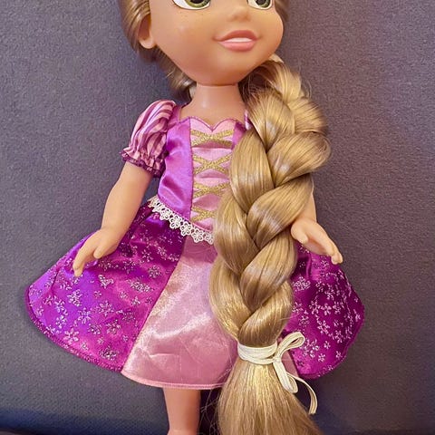 Disney Rapunzel dukke med langt, flettet hår. Dukken er iført lilla kjole og lilla sko. Inkluderer tilbehør som kam, hårspænder og figurer inspireret af Rapunzels historie. Egnet til børn og til leg og samling.