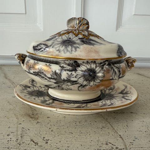 Meget smuk antik terrin fra Villeroy og Bock med låg og guldstaffering. Fabrikatet er stemplet i bunden. Også velegnet til blomsterdekorationer. Måler 30 cm i længden, 20 cm i bredden og er 13,5 cm høj.