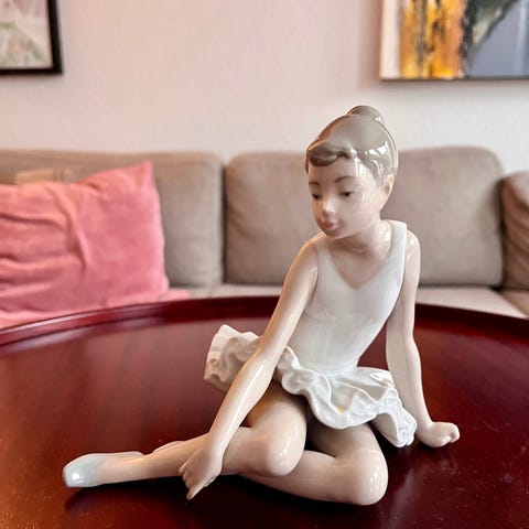 Porcelænsfigur af en kvinde iført kjole og hat, siddende med en høne i skødet og en kurv med høns ved siden af. Figuren er detaljeret med bløde farver og fine teksturer, egnet som dekorativ genstand.