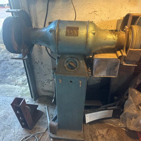 God stærk Arboga bænksliber med sten og stålbørste sælges. Monteret på sokkel og med nødstop, reset, start og sluk fra Danfoss.