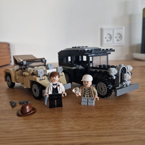 LEGO Indiana Jones Bil og Figurer Sæt med to biler i sort og beige farve samt fire minifigurer. Sættet indeholder detaljerede køretøjer og figurer, der passer til Indiana Jones temaet.