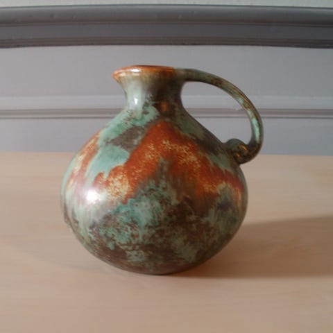 Skøn lille organisk rillet keramik kande glaseret i en fin lyseblå glasur fra bornholmske Michael Andersen & Søn – kan også bruges som en lille vase.
