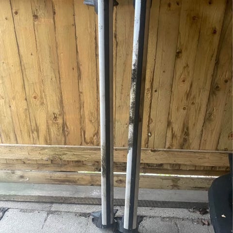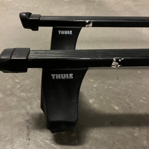 Sæt bestående af tagbøjler til bil, lavet i sort metal. Designet til at blive monteret på bilens tag for transport af ekstra bagage eller udstyr. Passer til forskellige bilmodeller afhængigt af monteringssystem.