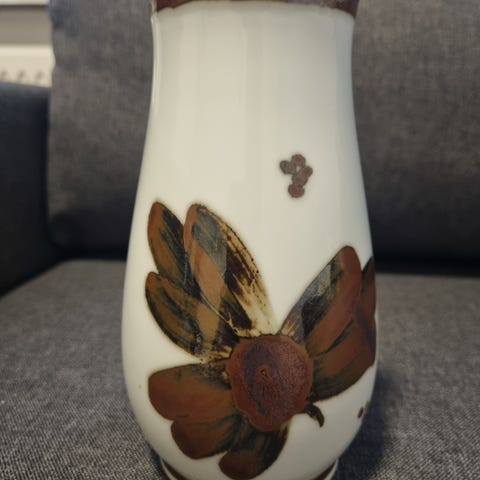 Fin vase fra Gudrun meedom produceret af bing og Grøndahl. 14 cm høj blomster motiv. Har et hak i bunden. Pris sat herefter .