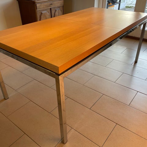 Spisebord i lyst træ med kraftig sort laminat.