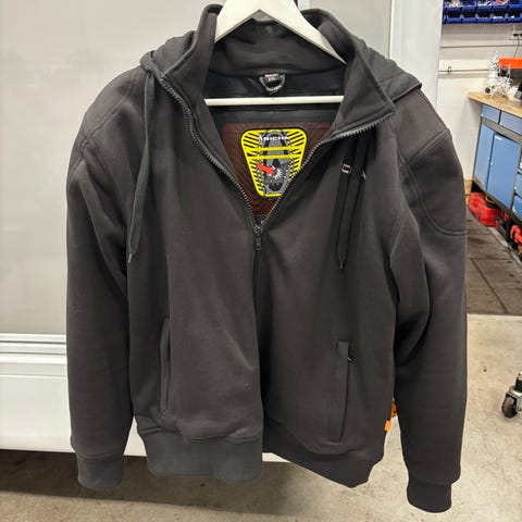 Richa Hoodie Jakke til herre i størrelse S. Jakken er sort og lavet af bomuld/ polyester/ elastan med D3O beskyttelsesindlæg på skulder, albuer og ryg som giver ekstra sikkerhed ved brug. Jakken har hætte og lynlås foran. Den er designet til at opfylde EN 17092-3:2020 standarden for beskyttelsesudstyr til motorcyklister.