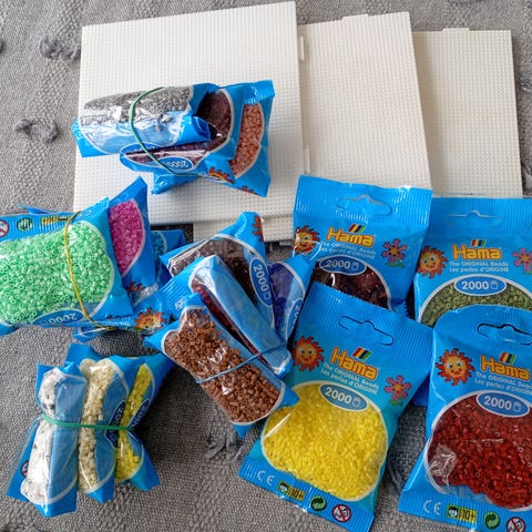 Sæt med assorterede perler og perleplader i forskellige farver og størrelser. Indeholder røde, hvide, blå og flerfarvede perler samt perleplader til brug i kreative hobbyprojekter og smykkefremstilling.