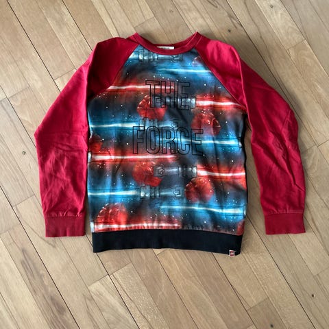 Sælger denne pakke med 5 t-shits og 1 swaetshirt i str 122/128 til 150 fra lego, star wars og hummel, i fin stand - prisen er for det hele