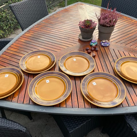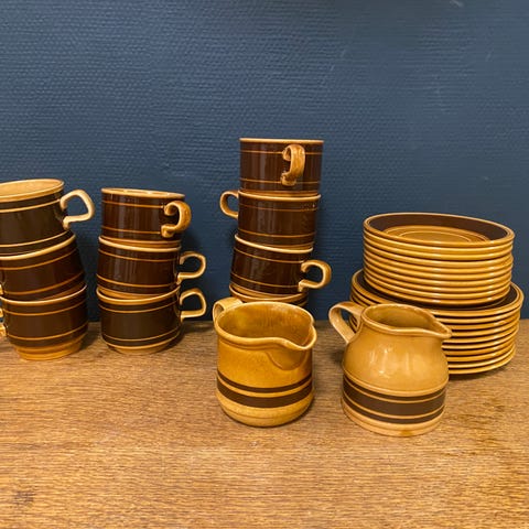 Et charmerende og robust retro-stel i brun/guld glasur, perfekt til både daglig brug og som pynt i det retro køkken.