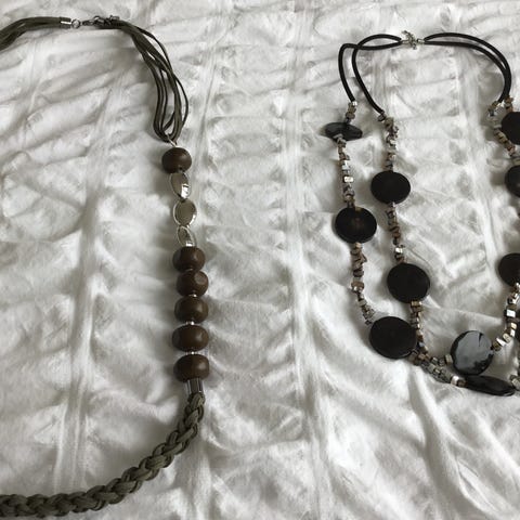 1 stk. Perlekæde med forskellige slags brune perler og bånd. Kan bindes om livet eller bare hænge løs om halsen. Længde 115 cm.