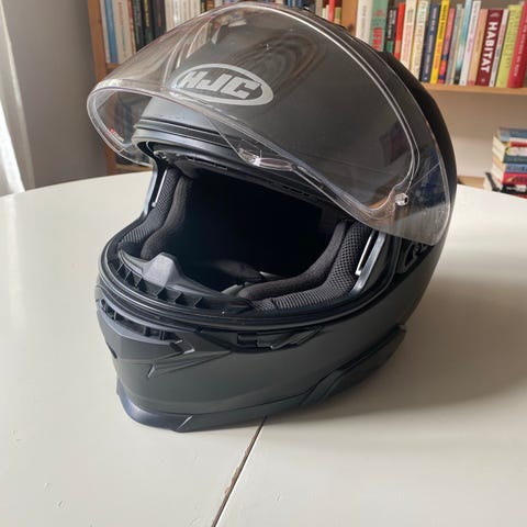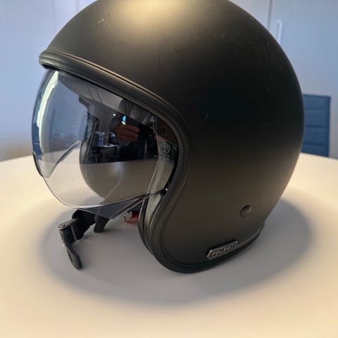 Næsten ny HJC motorcykelhjelm i mat sort farve med aftagelig hagebeskytter. Hjelmen har en integreret solvisir og ventilationsåbninger for forbedret komfort. Designet til at give beskyttelse og funktionalitet til motorcyklister.