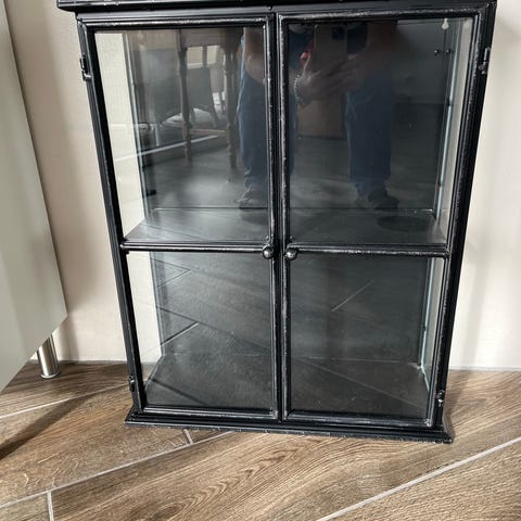 House Doctor Dot skab i sort metal med to døre. Skabet har et perforeret mønster på dørene og ben i metal. Det er designet til opbevaring og kan bruges i forskellige rum som stue, kontor eller entré.