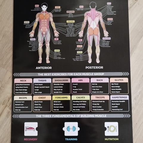 Blandet træningsbilleder, der viser forskellige øvelser og muskelgrupper. Perfekt til hjemmegym, fitnessrum, værelset eller forening.