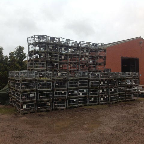 Metal gittervogn med træbund, velegnet til opbevaring og transport af varer. Gitterstrukturen sikrer god ventilation og synlighed af indholdet. Robust konstruktion med åbning i siden for nem adgang.