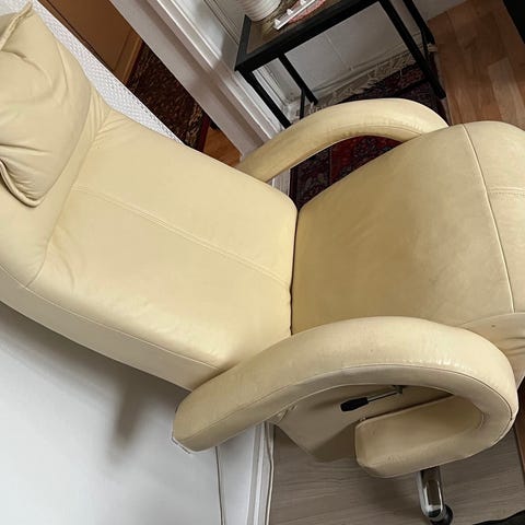 Rigtig god læder lænestol med 360 graders drejefuktion. Stabil og god at sidde i.
