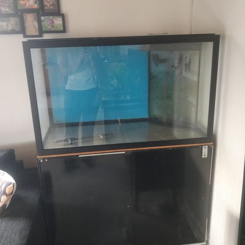 Red sea akvarium med tilhørende skab i hvid farve. Akvariet har en kapacitet på cirka 250 liter og er lavet af glas med hvidt kabinet i træmateriale. Skabet har mindre skader på hjørnet, som ses på billederne. Produktet er velegnet til saltvandsfisk.