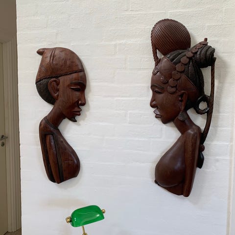 Sæt bestående af to indrammede kunsttryk med afrikanske motiver. Hvert billede viser mennesker i traditionel påklædning og naturmiljø. Rammerne er sorte og har glas foran. Velegnet til vægophæng i hjem eller kontor. 500kr Per stk, købt for 950 kr per stk