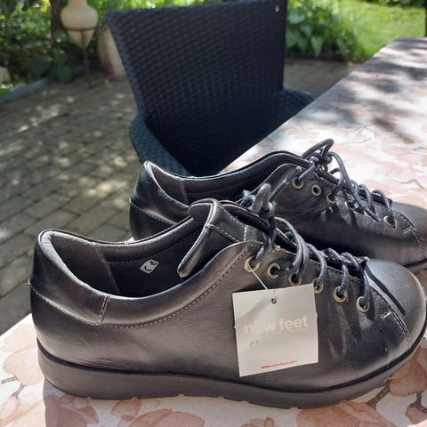 New Feet Andre sko i størrelse 36 til dame, i sort farve. Skoene har snørelukning og en hvid sål. Materiale og yderligere specifikationer er ikke angivet.
