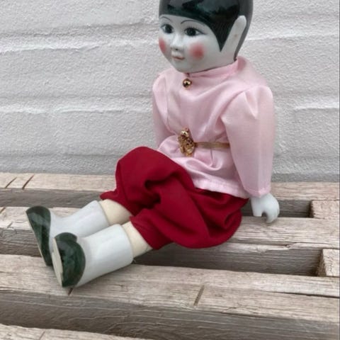 Håndlavet vintage elver porcelæn dukke. Lækker blond strit hår. Fint porcelæn hoved / hænder / fødder med sorte snabelsko. Buttet charmende stof krop. Måler Ca. 30 cm i hj.