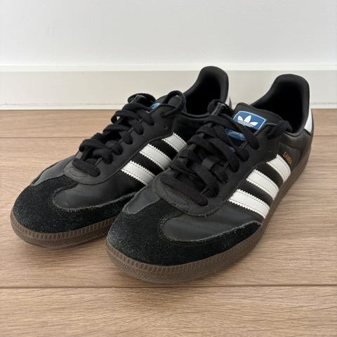 Adidas Sneakers/ dansesko i størrelse 44, 2/3 Skoene er sorte med hvide striber og snørebånd. Lækreste læder. Konverteret til dans med spalt under bunden. Meget sparsomt brugt pga forkert størrelse.