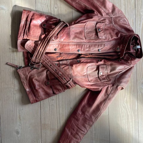 Den fedeste læderjakke/motorcykel jakke fra tyske Wilhelm Krawehl, Hamburg. Størrelse vurderer jeg til at small/medium. Lynlåse tjekket og fundet ok. Høj og tung læderkvalitet. Fedeste farve. Kig forbi og prøv den. Du finder ikke sådan en i den stand ofte. Se mine øvrige annoncer for mange spændende ting..