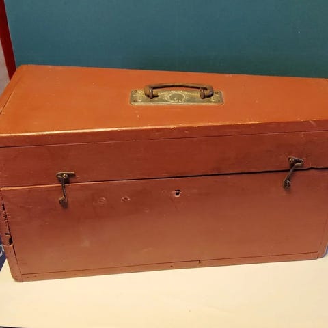 Vintage flettet opbevaringskasse med patina i mørkt træ med dekorative udskæringer og metalhåndtag. Kassen har en låsemekanisme foran og er foret med rødligt stof indvendigt. Velegnet til opbevaring af forskellige genstande. 2 stk. Højde 19 cm, længde 31,5 cm, brede 21 cm. Prisen er for 1. styk.