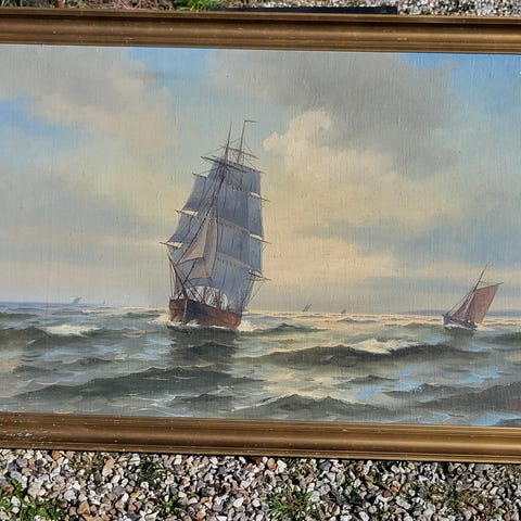 Maleri som viser en seilbåt på vannet med et kystlandskap i bakgrunnen. Bildet har en ramme i tre og viser en rolig sjø med skyet himmel. Passer til dekorasjon i hjem eller kontor.