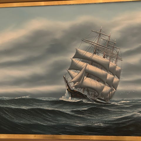 Maleri med seilbåt og kystlandskap
