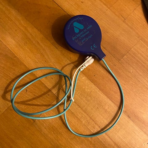 En Sengevædningsalarm men sætter på armen og underbukser. Ved vandladning vibrere den og giver en lyd. Oplades med en alm ledning til adapter. Kan evt medfølges ved ønske