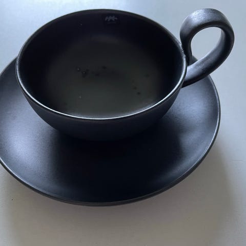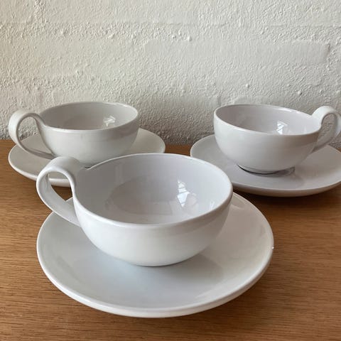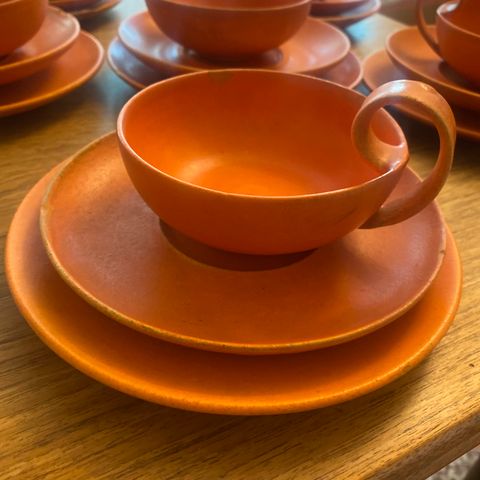 Tekopper (12 stk), m Underkop, 5 sidetallerken . Mælkekande., hvid glasur. Fra det rigtige Herman A Kähler i Næstved.