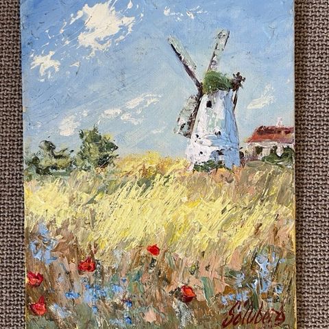 Motiv af landskab. Mål: 60x90 cm. Ramme i sølvfarve. Maleriet viser en naturscene med kornmarker, blomster og havet baggrunden. Signeret af kunstneren, Sølvberg, og derfor nok Sønderjylland. Malet på panel.