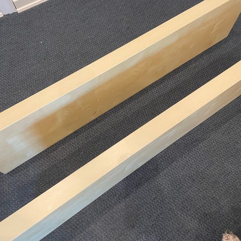 2 stk svæve hylder i røget eg målene er 80x19x2 cm. Har en sort plet i træet men ellers i fin stand. Afhentes I Korsør.