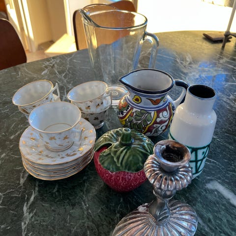 Vaser, glasskåle, lysestager, tallerkner, sukkerskåle, skærebrætter, redskaber