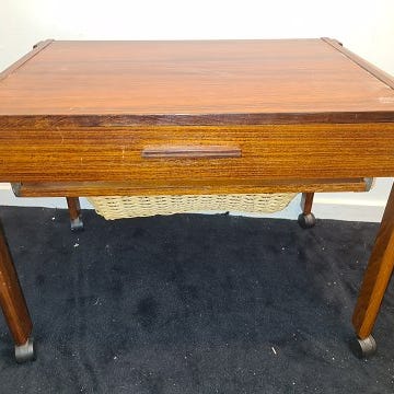 Sybord fineret med palisander, front med to skuffer, heraf en med små rum, herunder kurv af flet, står på ben som afslutter (den har været på hjul, men men de mangles nu), er fra 1960erne. Fremstår med brugsspor, herunder mærker og lille skjold på bordplade.